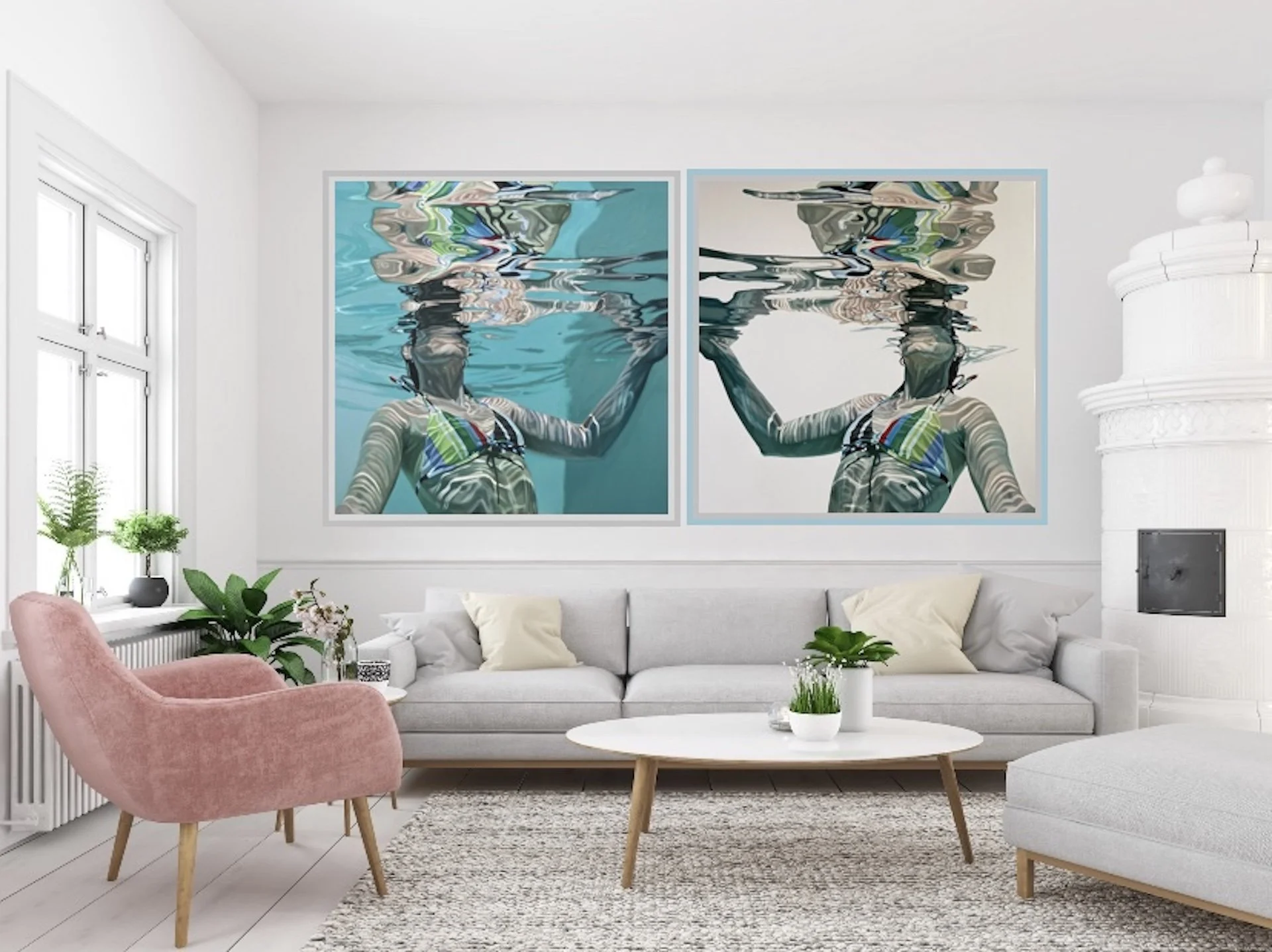 Water is a recurring theme in her work as it provides a means to explore abstraction as it occurs naturally, resulting in paintings that harmoniously combine realistic and non-objective elements.
